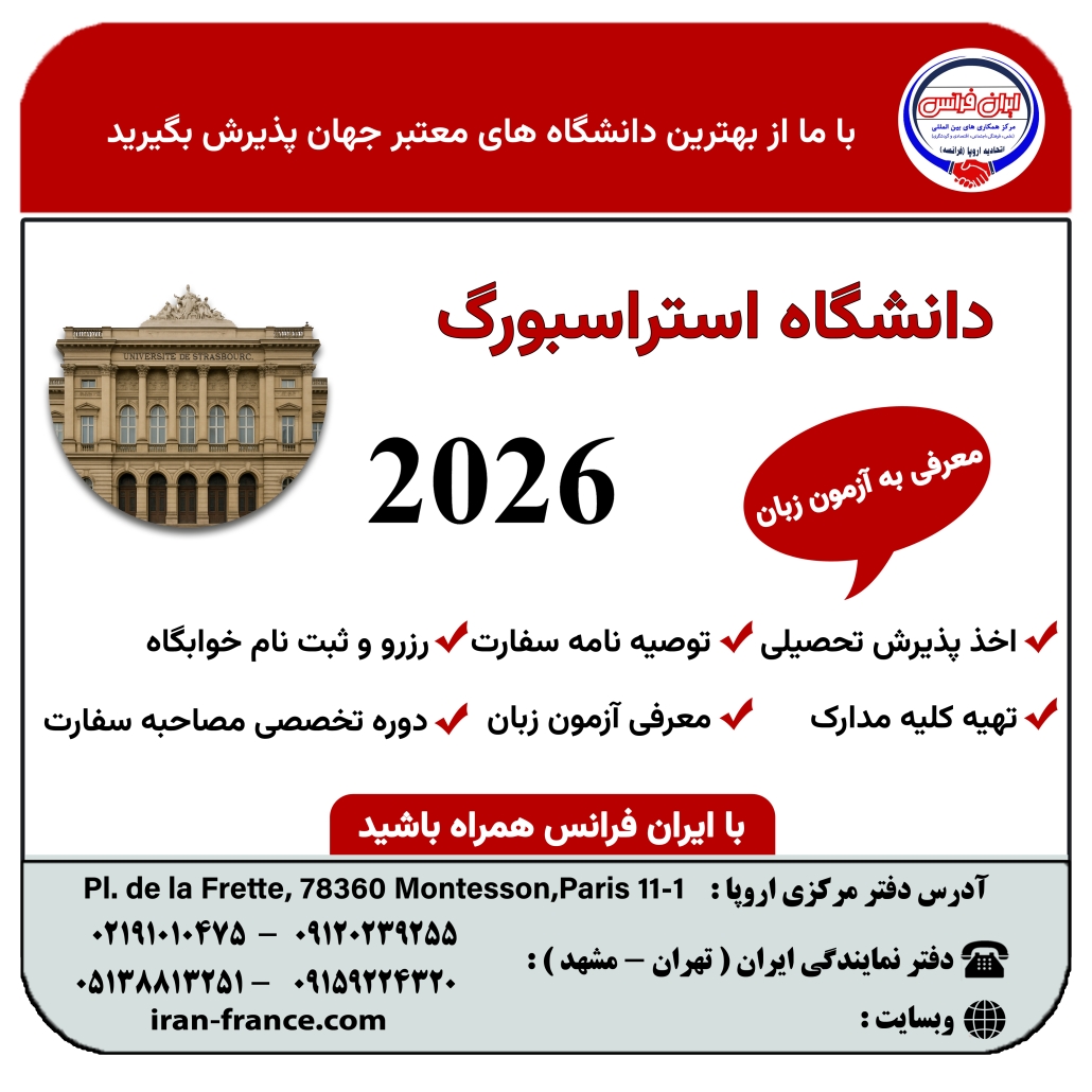 پیرو تفاهم نامه رسمی موسسه فرهنگی ارسطو و ایران فرانس با دانشگاه استراسبورگ فرانسه همه علاقه مندان به تحصیل در فرانسه می توانند جهت اخذ پذیرش تحصیلی خود در سال ۲۰۲۶ از هم اکنون اقدام نمایند . این دانشگاه تعداد محدودی از ظرفیت های امسال را به مرکز ایران فرانس اختصاص داده که کلیه متقاضیان میتوانند از هم اکنون نسبت به ثبت نام به این مرکز مراجعه نمایند . زبان تحصیل در این دانشگاه برای متقاضیان ایران هم انگلیسی و هم فرانسه بر حسب انتخاب داوطلب می باشد .